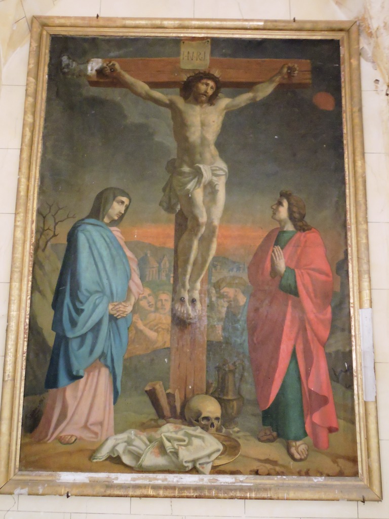 Ce tableau est l'oeuvre de Justin Pibou, prêtre originaire de Miremont. Il est l'auteur de nombreuses peintures murales et de nombreux tableaux pour les églises de la Région. Sur cette Crucifixion le Christ est encadré par la Vierge et par St Jean. A l'arrière plan se trouve Marie Madeleine.1863 – peintre : Justin Pibou. Huile sur toile, Eglise St Barthélémy.